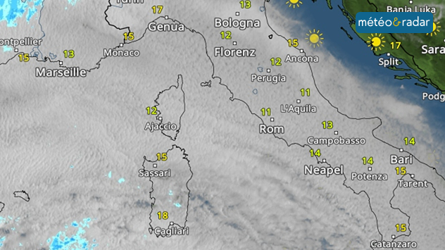Dimanche matin, une immense couverture nuageuse s'est étendue sur l'ouest et le centre de la Méditerranée. Vu du sol, le ciel est simplement gris et sans relief. Mais vu du satellite, l'œil averti remarque immédiatement que d'importantes quantités de poussière saharienne sont en cause.