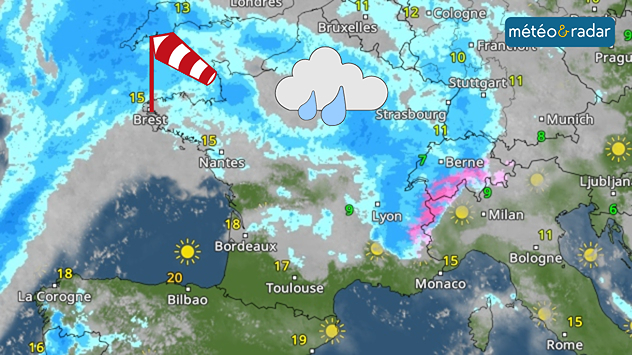 Il pleut d'ailleurs une bonne partie de la matinée entre la Bretagne, les régions centrales et le Nord-Est. La perturbation se décale essentiellement vers le Nord-Est durant l'après-midi, où il pleut faiblement.