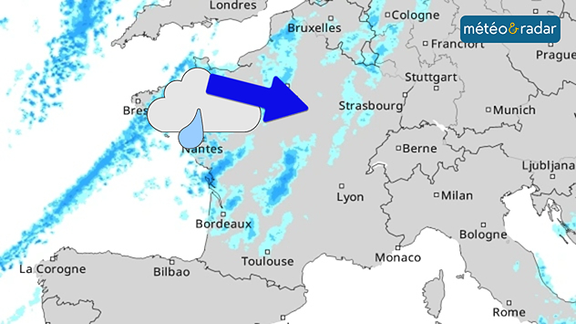 En cours d'après-midi, ladite perturbation se trouvera du Centre-Ouest au Nord-Est, toujours accompagnée de pluies éparses. Elle se décalera du Bordelais au Centre-Est durant la soirée.