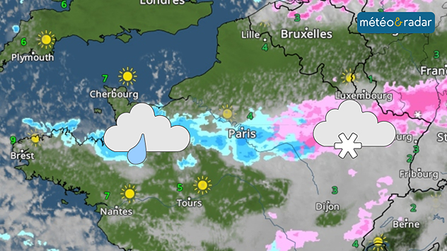 Les précipitations sous forme de pluie sont signalées en bleu ou violet, la neige en rose alors que la foudre se présente sous forme d'un point jaune ou orange.