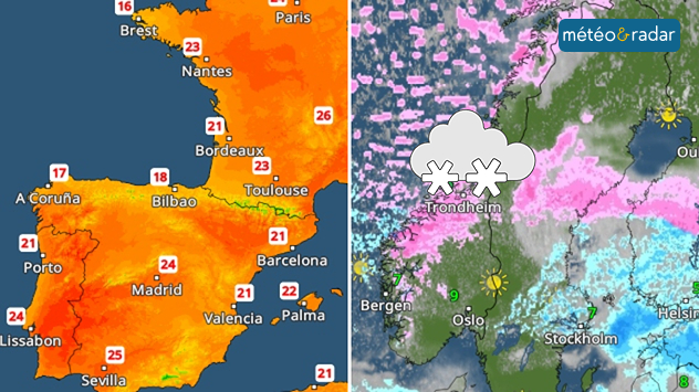 Carte des températures : dans certaines régions du sud et de l'ouest de l'Europe, on se croirait déjà en début d'été. En revanche, le radar météo annonce de nouvelles chutes de neige en Scandinavie.
