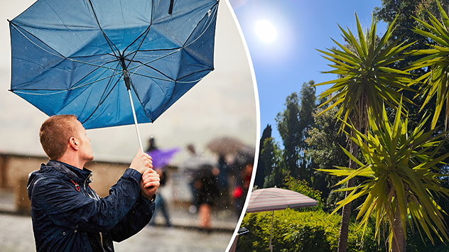 Carte météorologique de l'Europe avec une dépression et le symbole d'alerte au vent. À côté, des montagnes russes symbolisant les fortes variations de température. Illustration d'un passage rapide du chaud au froid.