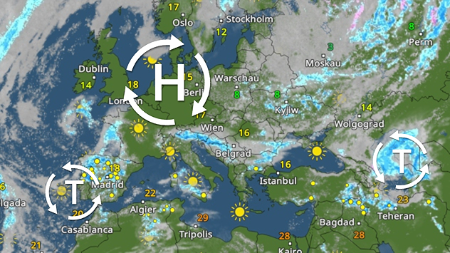 Carte de l'Europe avec un radar des températures à l'ouest et un radar météo au nord. Températures douces à chaudes sur la péninsule ibérique. Neige et froid clairement visibles en Scandinavie.