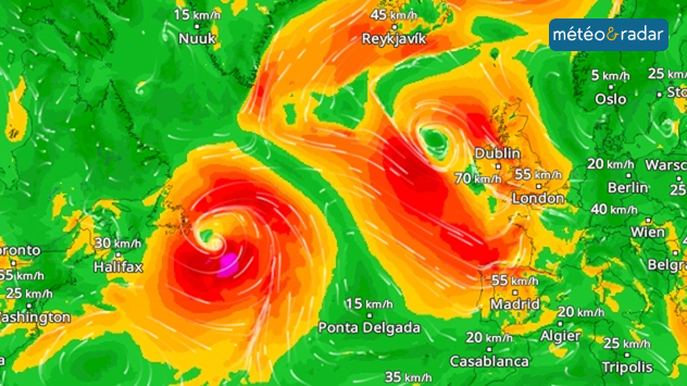 La carte des vents montre deux violentes tempêtes sur l'Atlantique, entre l'Amérique du Nord et l'Europe.