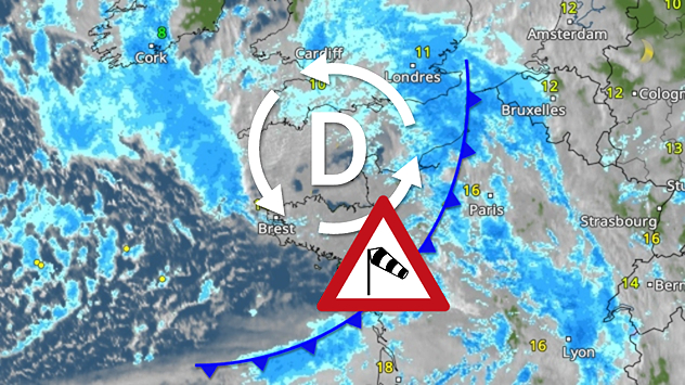 Grue de chantier renversée devant un immeuble résidentiel et carte météo avec symbole de tornade près de Paris.