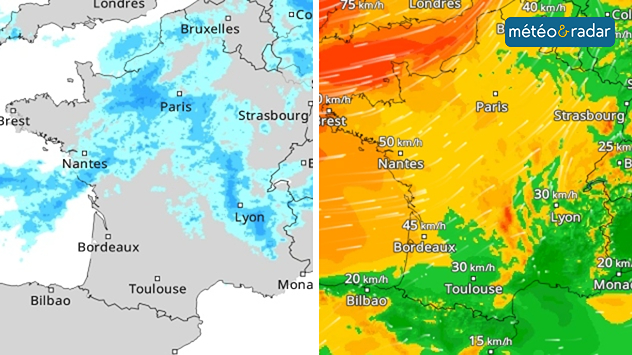 Carte des précipitations dimanche (à gauche) et des vents samedi (à droite)