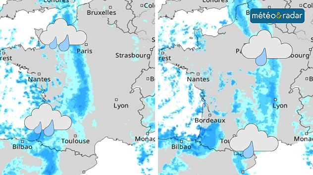 Carte des précipitations jeudi matin (à gauche) et jeudi après-midi (à droite)