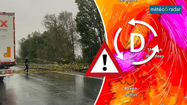 Les violentes rafales de vent générées par la tempête Amy, visibles sur notre carte des vents. © DeKerros / Des arbres arrachés dans le Loiret ce 4 octobre.