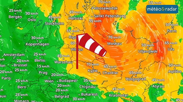 La carte des vents montre un vaste champ de tempêtes s'étendant autour du centre de la dépression située au nord-est de Moscou.