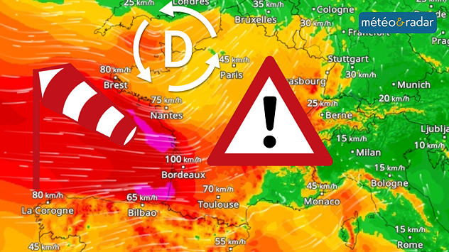 Les bourrasques sont susceptibles de dépasser les 100km/h jusque dans les terres du Sud-Ouest, et approcheront sans doute 130 à 150km/h sur les hauteurs, et les caps exposés du golfe de Gascogne et du golfe du Lion.