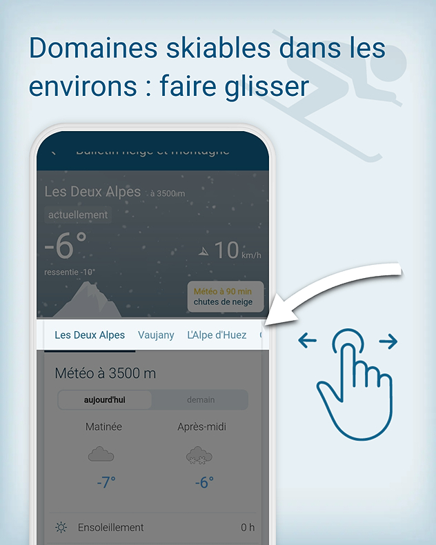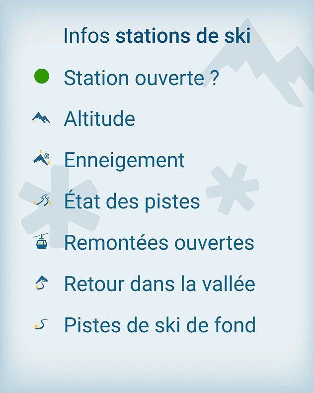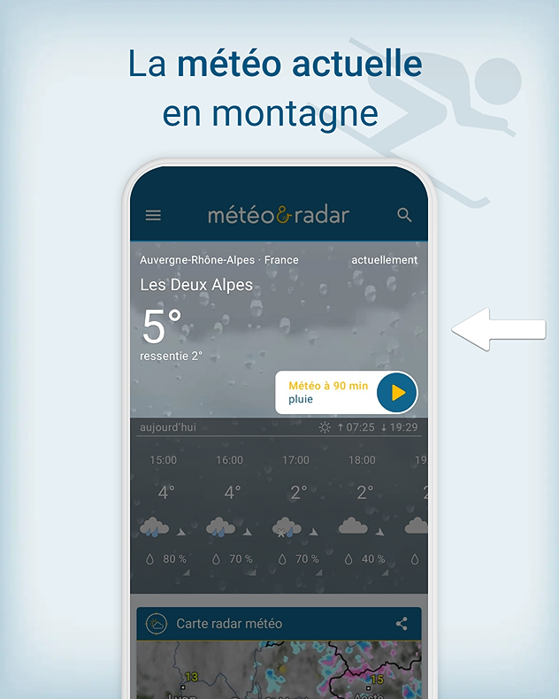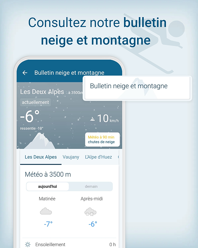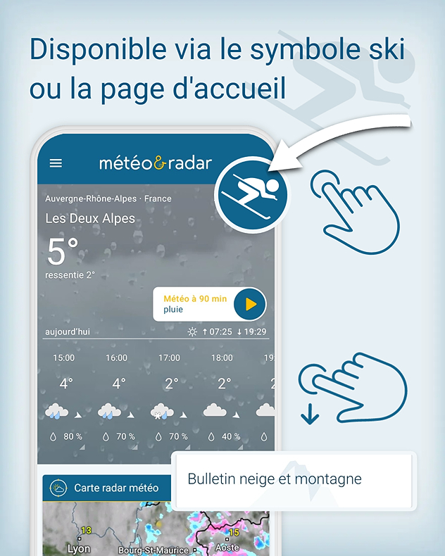 Pour tous les passionnés de neige, l’application Météo & Radar et son radar météo sont aussi essentiels en hiver que les skis, le casque et les bâtons. Avec le bulletin neige et montagne, nous vous proposons un service unique et complet.Depuis chez vous, vous pouvez savoir en un instant s’il vaut la peine d’emporter votre équipement de ski. Retrouvez toutes les informations importantes sur le domaine skiable le plus proche, ainsi que sur l’enneigement en vallée et en altitude, présentées de manière claire et pratique.Chaque jour, des données actualisées sur l’état des pistes vous sont fournies. En complément, des images de webcams vous permettent de découvrir en temps réel l’aspect de votre destination.Vous êtes amateur de ski nordique ? Vous êtes également bien préparé : en un coup d’œil, consultez le nombre de kilomètres de pistes damées.Planifiez facilement votre journée à la neige grâce aux prévisions dédiées à la montagne et au ski :