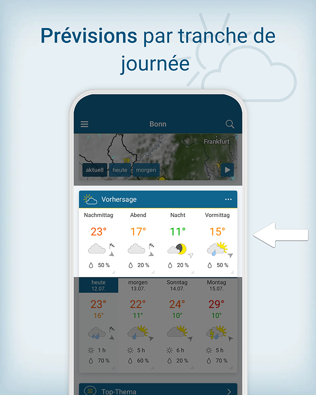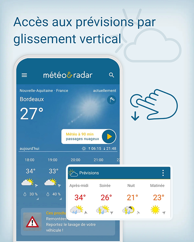 Vous prévoyez une sortie à vélo ou vous souhaitez consulter la météo prévue sur votre prochain lieu de vacances ? Grâce aux prévisions locales de l'application Météo & Radar, vous pouvez consulter la météo partout dans le monde.