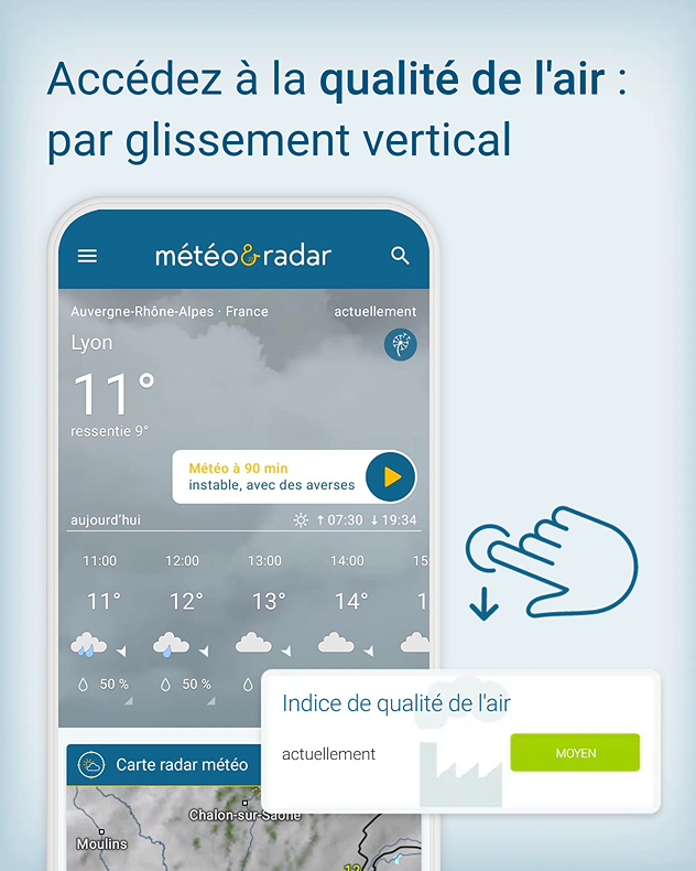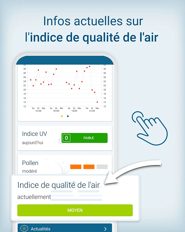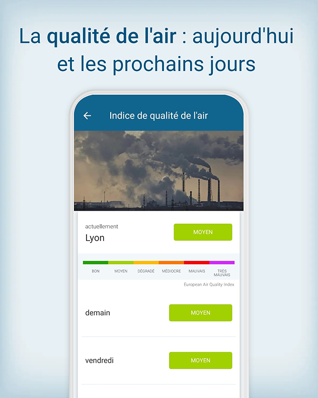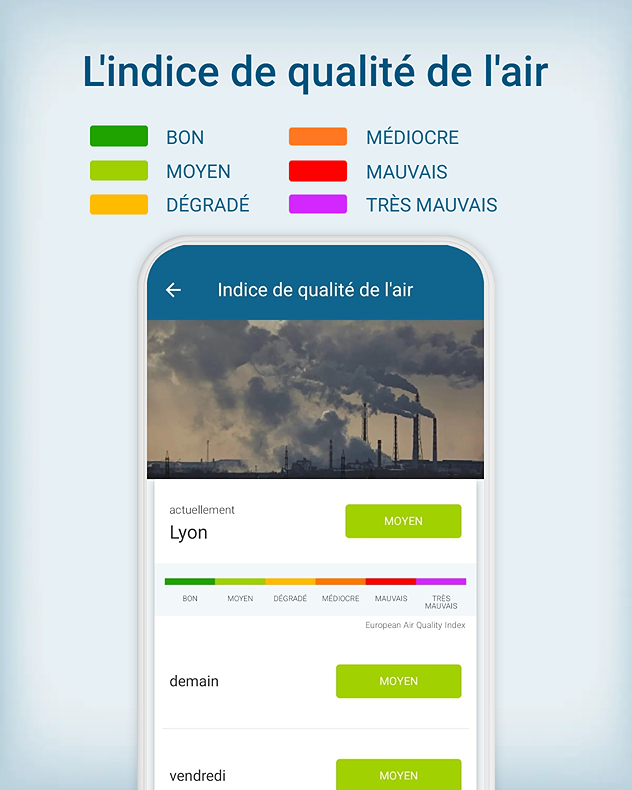 Tout le monde s'est déjà posé la question de la qualité de l'air. L'application Météo & Radar vous apporte la réponse. En plus des prévisions météorologiques complètes et nos cartes radar météo, vous pouvez également consulter des informations détaillées sur l'indice de qualité de l'air.