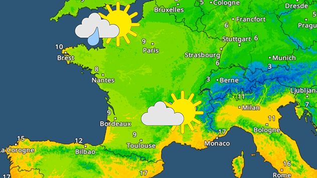 Aujourd'hui : le soleil domine toute la journée. La température actuelle est de 9 degrés. Et elle augmente au cours de la journée jusqu’à 17 degrés.
